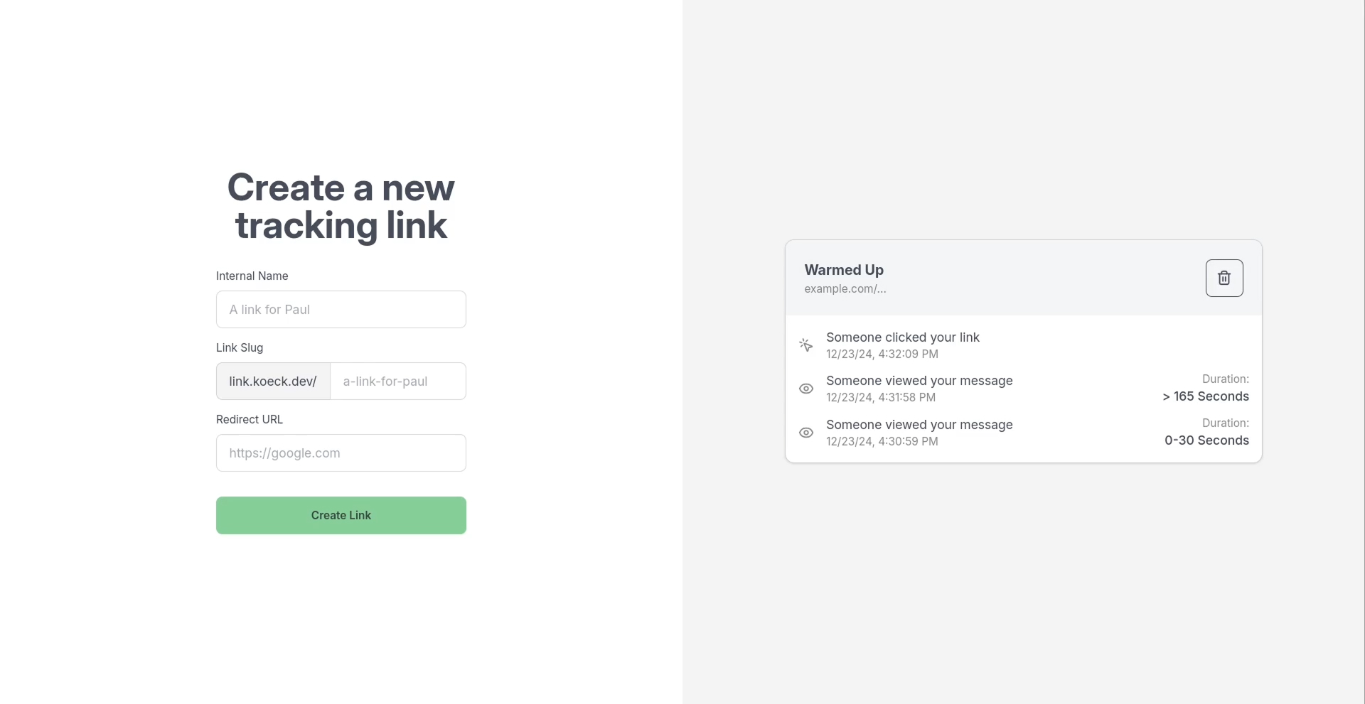 I built a small PoC app that automates the whole thing. You create a tracking link with a slug and a redirect URL, and share the resulting link anywhere on Discord. A few details worth calling out: